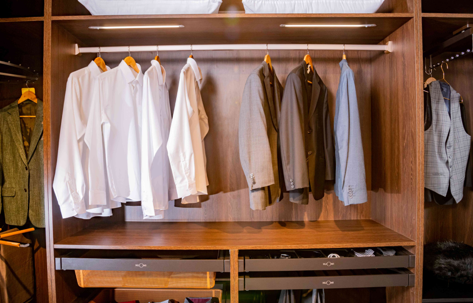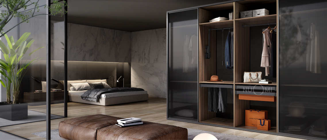 Our Nuomi Hera range represents the velvet smooth feel of deluxe living. Clad in leather and reinforced stainless steel, Hera boasts an array of accessories from soft-closing leather baskets, trouser racks, lift-able hangers to high-tech, built-in safes with jewellery trays for your more treasurable accessories.